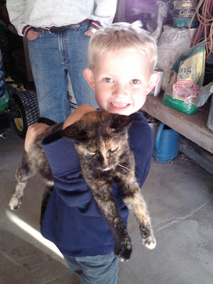 He is holding one of the kitties and is being so careful.. He liked the grey one and wanted to take him home. I said, "Rocco your dog doesn't like cats and that would not be a good idea".. He said "O.K".. then he asked Caroll if he could come over and visit them as they grew up.. He loves cats.. He has a cat that lives at his Dad's house . His cat is a large yellow cat named GoGo. It used to be named Jacob, but he has a good friend named Jacob and changed the cats name..